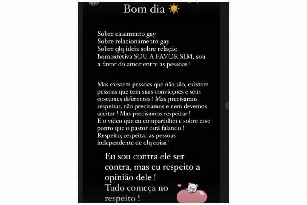Assim que viu a repercussão negativa da postagem, Caio Castro fez outro stories no Instagram tentando se desculpar. “Sobre casamento gay, sobre qualquer relação homoafetiva, sou a favor, sim. Sou a favor do amor entre as pessoas”, escreveu o ator.