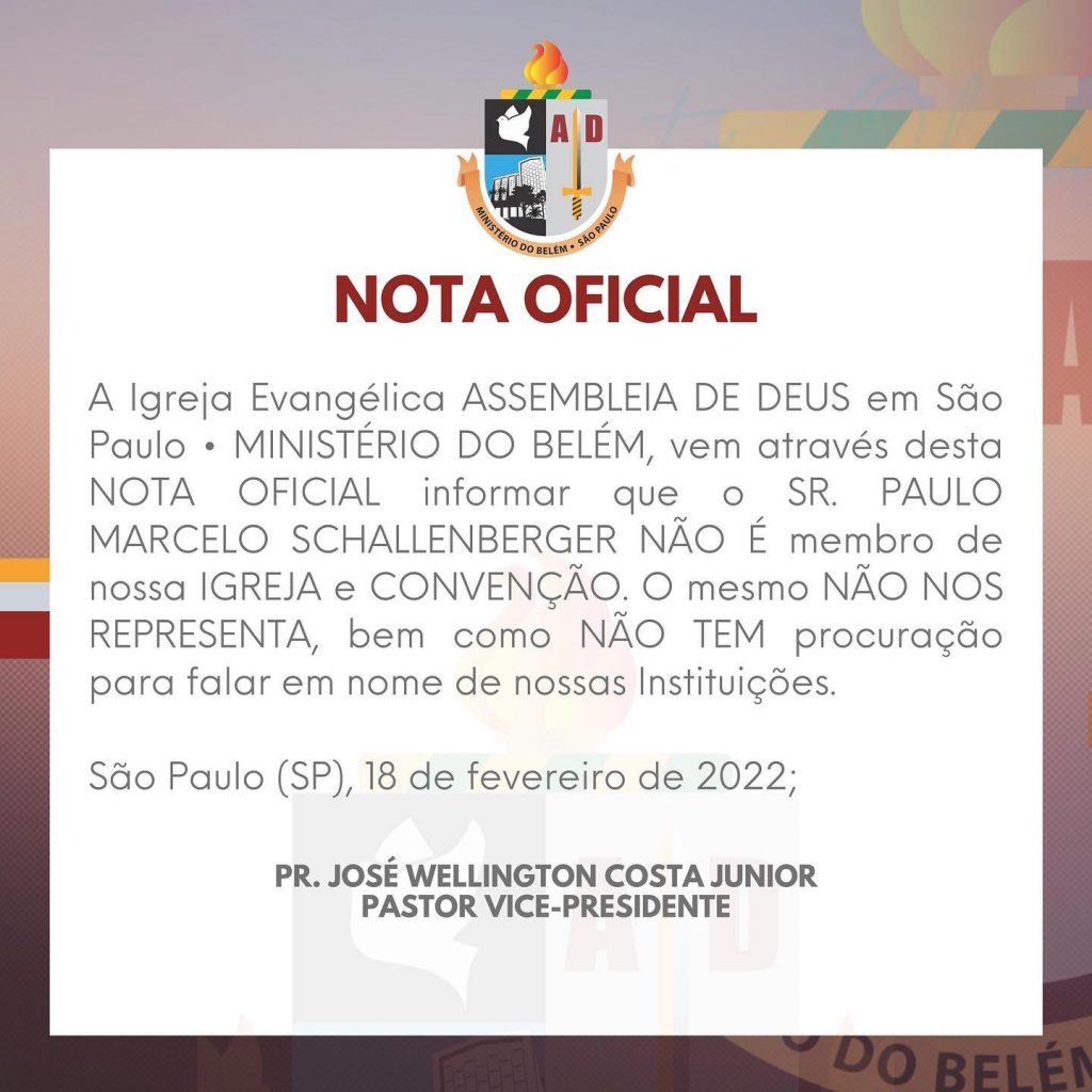 Assembleia de Deus do Ministério Belém em São Paulo também publicou um comunicado oficial nas redes sociais informando que o pastor Paulo Marcelo Schallenberger não é membro da igreja, e nem faz parte da Convenção das Assembleias de Deus no Brasil (CGADB).