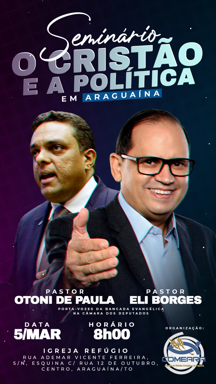 O feriado de Carnaval em Araguaína (TO) será marcado com seminário O cristão e a política. O encontro será na Igreja Refúgio, que fica localizada na rua Ademar Vicente Ferreira, S/N, esquina com a Rua 12 de outubro, Centro. O evento terá início às 8h00 neste sábado (5/3).