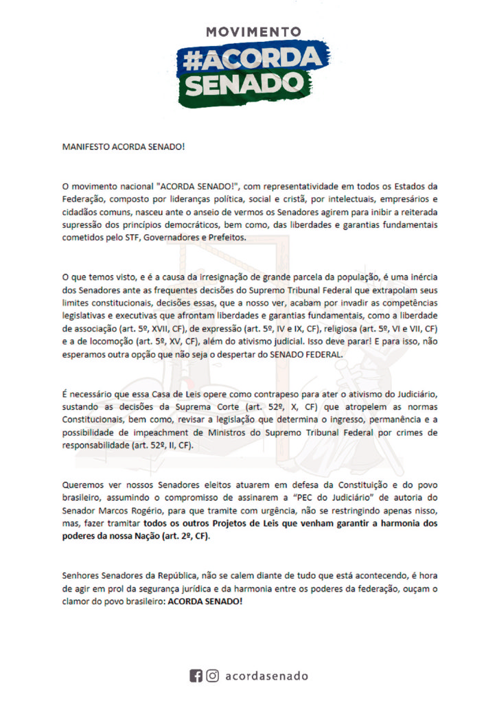 Politica Manisfesto Acorda Senado ! Published 5 anos ago on 20/04/2021 By jornalismo Compartilhe Related Topics:constituiçãoliberdade de expressãoliderançasmovimento acorda senadosenadores Up Next Pastores se reúnem com Bolsonaro para orar e falar “sobre a Igreja e o Brasil´ Don't Miss ACORDA SENADO Continue Reading Você pode gostar “Os cristãos precisam manter as convicções bíblicas e ainda mostrar graça” STF marca posse de André Mendonça para 16 de dezembro “Na vida, a Bíblia; no STF, a Constituição”, diz André Mendonça em sabatina Após reprimir liberdade de imprensa, censura em Hong Kong avança sobre o cinema Senado aprova Aras para novo mandato na Procuradoria-Geral da República Liberdade de expressão e proteção da honra em nossa Constituição Sikêra Júnior é absolvido após chamar homossexuais de “raça desgraçada” LEI DE RACISMO É APLICADA NA BA PARA CONDENAR EVANGÉLICA POR ATAQUES AO CANDOMBLÉ Por que o STF odeia o Brasil? Como freiá-lo? Movimento Acorda Senado: Líderes alertam sobre riscos ao Cristianismo no Brasil Clique para comentar Leave a Reply Cancelar respostaO seu endereço de e-mail não será publicado. Campos obrigatórios são marcados com *Comentário * Nome * E-mail * Site Salvar meus dados neste navegador para a próxima vez que eu comentar.